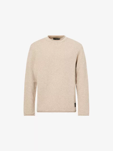 • Crewneck, long sleeves, embroidered logo patch at front, all-over knitted texture