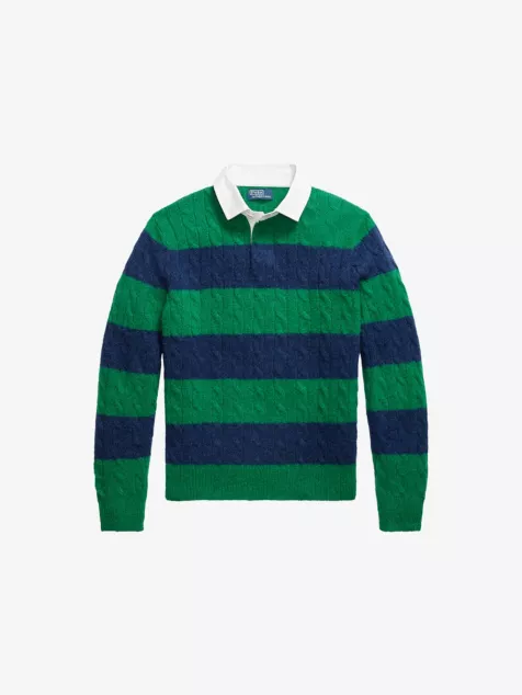 - Regular fit, collar, long sleeves, logo embroidery at chest, cable-knit pattern, ribbed trims